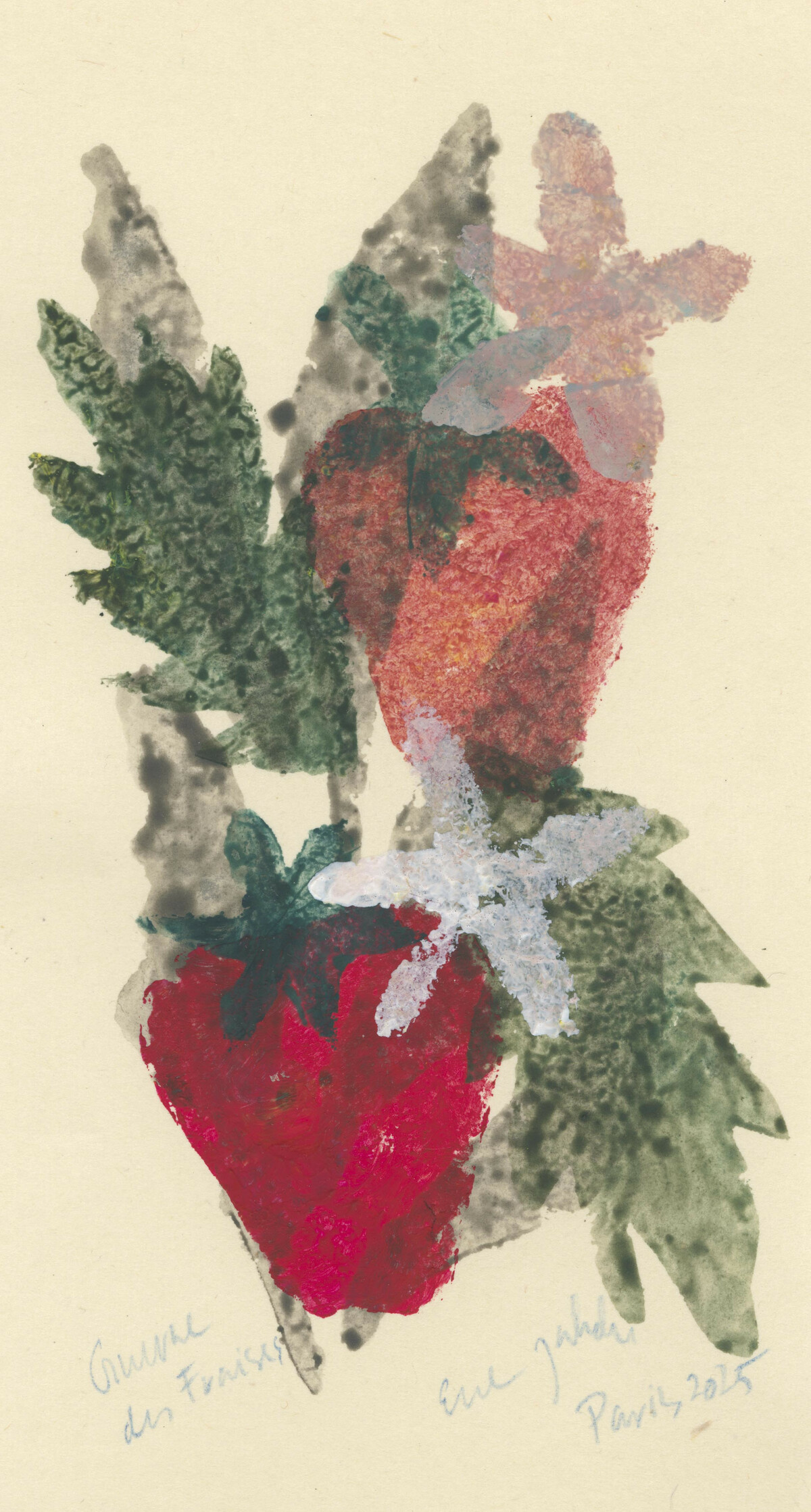 Conceptualisme recyclé est un cadeau idéal pour un artiste auteur. Imprimé sur le papier Urssaf des années 70 avec les palettes de gouaches abandonnées par les enfants de la maternelle, L'artiste Ene Jakobi nous impose ici une double-lecture de notre société . Depuis janvier 2025 Ene Jakobi est artiste accréditée à l'Assemblée nationale. Sur place, pour les artistes, les activités dites salissantes sont interdites. C'est donc dans un atelier d'une amie et artiste célèbre qu'elle débute une longue réflexion sur l'abus de pouvoir, la violence et l'empêchement . Conceptualisme recyclé est né. Estampe au pochoir sur le chutes de papier Urssaf des années 70. Guerre des fraises