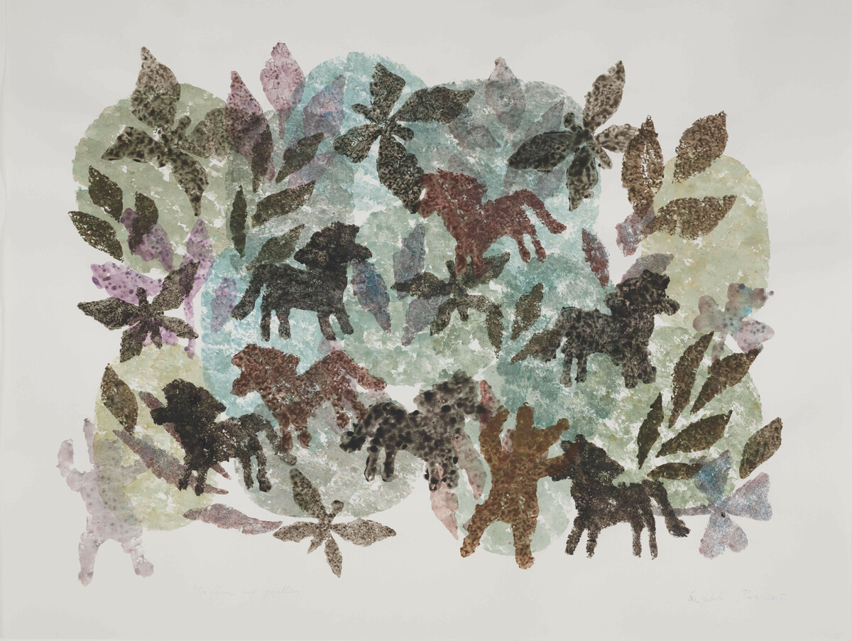 C'est une année de violence que l'artiste Ene Jakobi exprime via l'estampe au pochoir. Selon le Cnap la technique d'estampe au pochoir est bien une technique d'estampe. Les pochoirs sont ici réalisés avec les cartons et les emballages du chocolat, les gâteaux secs, découpés à la main par l'artiste. Les couleurs fades? Oui. L'artiste a demandé pour la réalisation de cette estampe les palettes laissées par les enfants à la maternelle. Accréditée à l'Assemblée nationale en tant qu'artiste, Ene Jakobi réalise cette série qui reflète les violences de notre époque. Chaque estampe demande de 50 à 100 passages