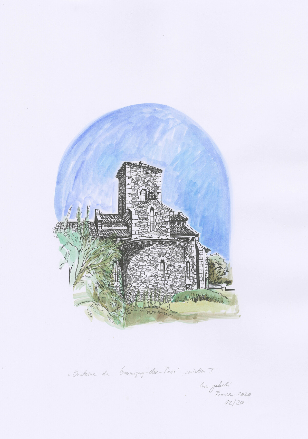 Série sur la Loire laisse la parole aux écrivains et aux poètes. Réalisée pendant le confinement car l'artiste est alors mandatée pour faire des croquis d'audience. Jet d'encre digiraphique, gouache sur papier