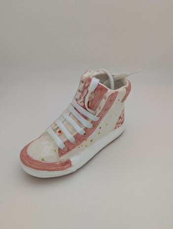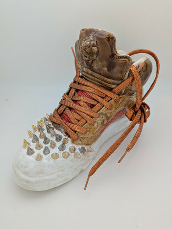 BIBLIOTHEQUE DE FORMES MEMOIRES Le projet est une installation en deux parties. La première partie est un ensemble d’une cinquantaine de pièces, accroché au mur. Il s’agit d’une bibliothèque de « formes mémoires ». Les « formes mémoires » sont composées de vaisselles détournées, à l’image des assiettes décoratives que l’on peut trouver sur les murs de nos grands-mères. Dans chacune de ces pièces est contenu une prise d’empreinte du corps, ou d’un élément du quotidien comme une trace ou un souvenir. Au mur, les différentes parties d’un « soi » présentées comme une sorte de cartographie intérieure, tel un cabinet de curiosité où venir piocher des souvenirs. C’est cette bibliothèque de « formes mémoires » qui sert de base de recherche pour la conception de la deuxième partie de l’installation. Une colonne « Totem » entièrement fabriquée par l’assemblage de pièces estampées directement dans ces « formes mémoires ». Une colonne « Totem » comme une ruine ou le vestige d’un sanctuaire retrouvé ou encore les premières pierres d’un sanctuaire à construire. Des feuilles d’or, d’argent et de cuivre comme des voiles, comme des peaux, revêtent chacun des objets conçus par Stanislas Cornier, du plus rudimentaire au plus baroque. Elles viennent éteindre, en l’enjolivant un peu, sa peine et donner de l’éclat à son humour désabusé. Aucune hiérarchie n’oppose les ‘contenants’ aux objets d’art. Tous déclarés fonctionnels sans qu’aucun ne le soit vraiment, leur propos se situe ailleurs. S’ils incarnent naturellement une forme de critique sociale visant à condamner la superficialité et le consumérisme, ses Formes-mémoires véhiculent surtout l’idée du cérémonial qui rythme le quotidien de chacun (…). 2023 Faïence noire chamottée recyclée, émail rouge à effets, feuille d’or 22 karats, strass Swarovski, vernis gomme laque et vernis brillant. Dimensions : long = 38.5cm, large = 28.5cm, profondeur = 6cm Poids : 1.195 kg Envoi possible, frais d'envois en sus à la charge de l'acheteur, mais préférer un enlèvement en main propre à l'atelier.