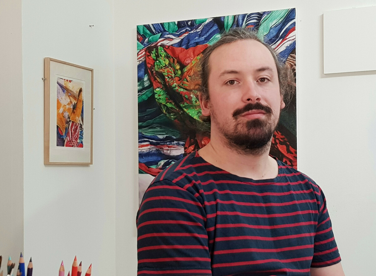 Je vis et travaille dans le Bessin. D’abord attiré par la peinture et le dessin, je sors de l’Esam Caen/Cherbourg en 2018. J’y développais des installations et des assemblages composés de matériaux pauvres et récupérés. Jeux de surfaces et de rapports colorés, ces assemblages appelaient un retour à la peinture. Aujourd’hui, j’explore uniquement ce médium.En plus des natures mortes, qui résultent de mes premières recherches plastiques, je peins des sujets floraux et parfois des portraits ou des scènes de genre.