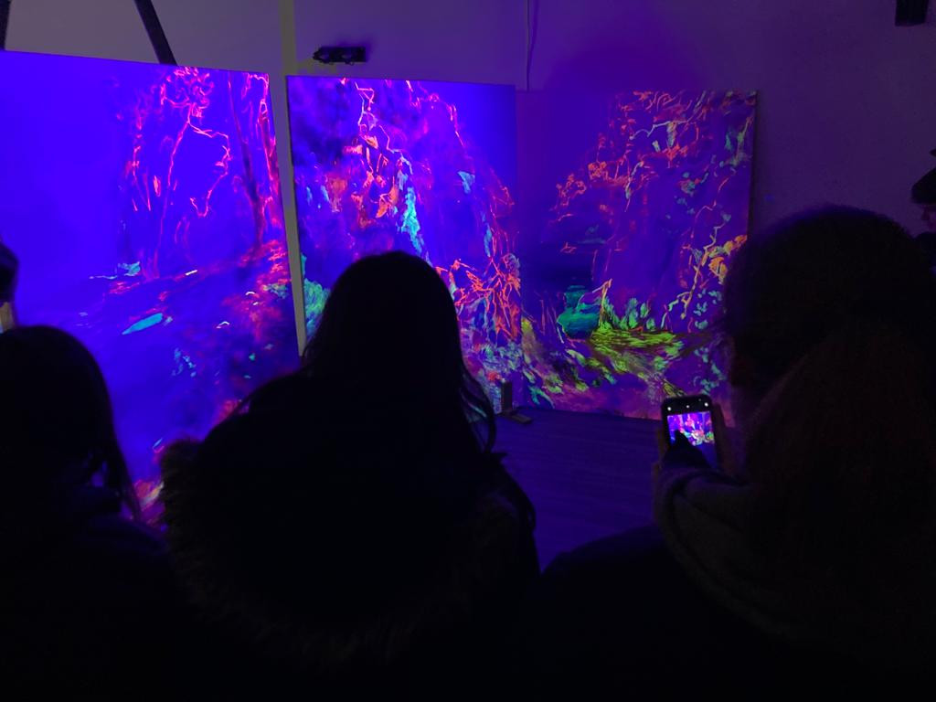 Cette grande toile a été réalisée pendant ma résidence à La Source-Garouste en 2023, en Normandie. Elle est à la fois visible de jour et de nuit, Elle se "métamorphose" selon la lumière du jour ou dans l'obscurité éclairée par de la lumière noire. Elle révèle alors un travail invisible enfoui sous les couches successives de peinture : on voit les pigments fluorescents réapparaitre, dessinant une tout autre histoire qui se raconte sous nos yeux.