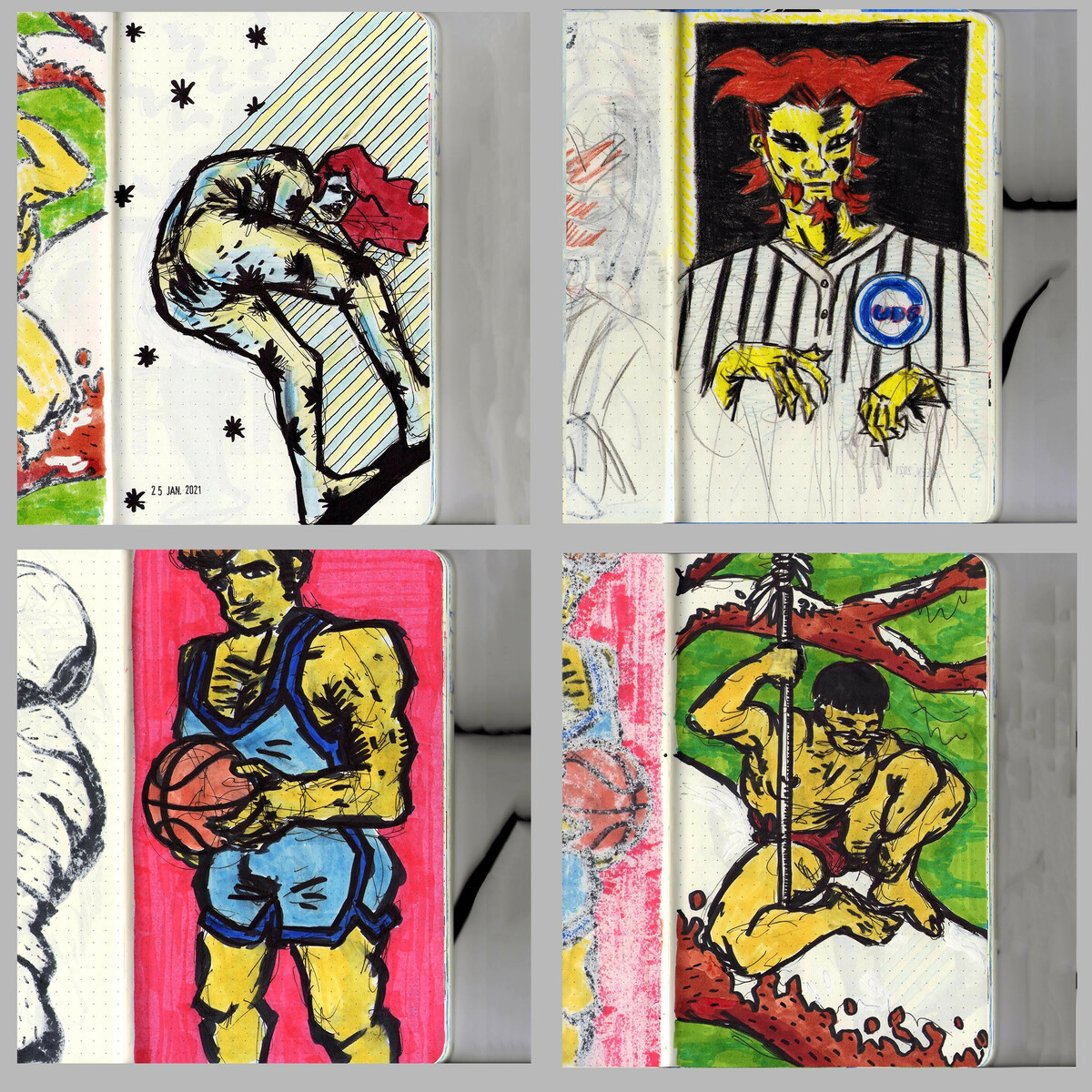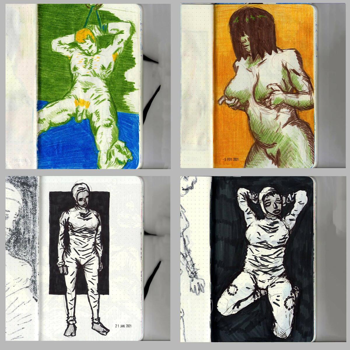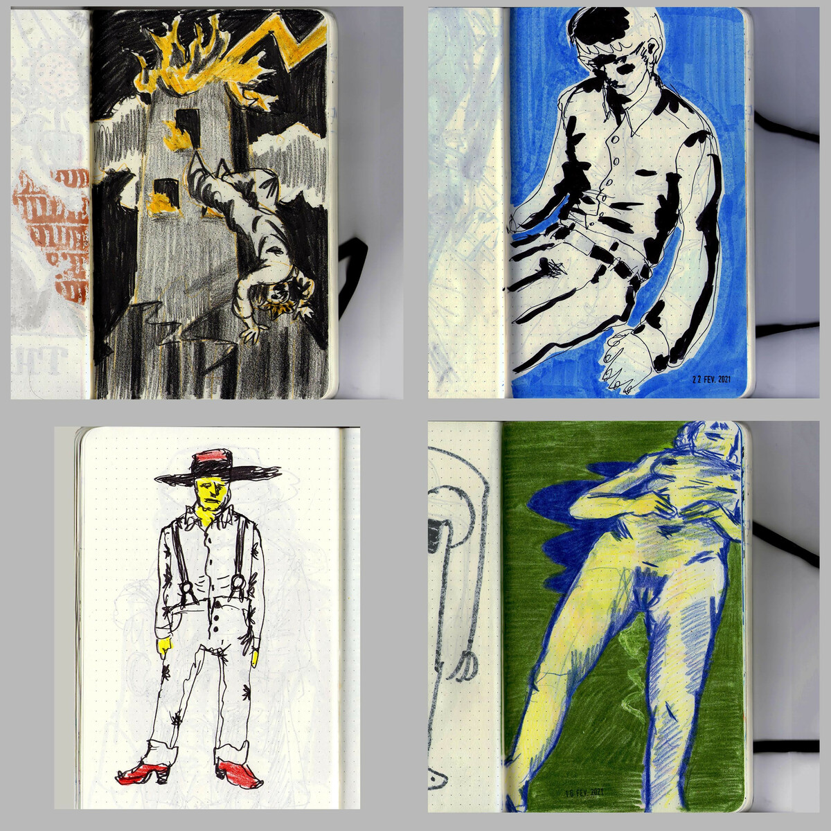 Pages datée et signée issue d'un carnet moleskine réalisé pendant la première moitié de l'année 2021 et exposées au Labo des Arts à l'occasion de l'exposition "The Horny Never Die". (Dessins livrés dans une pochette cristal à PH neutre.) contact : blanchard.emilien@gmail.com