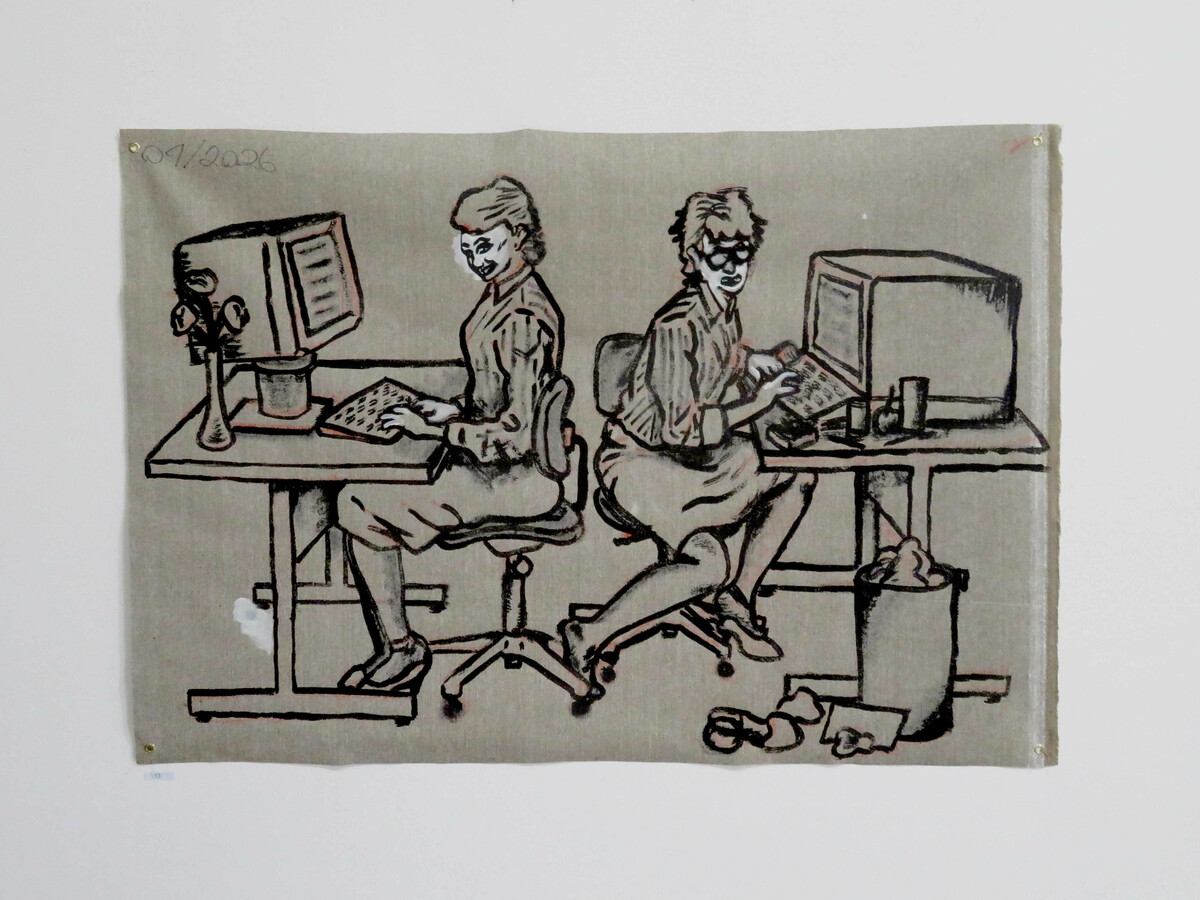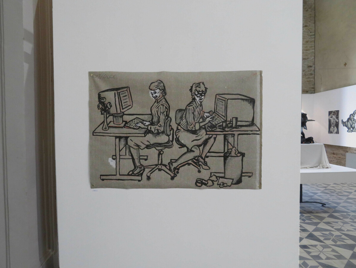 acrylique sur toile, grand format, dessin d'après une publicité pour ordinateur ergonomique, années 80 environ.