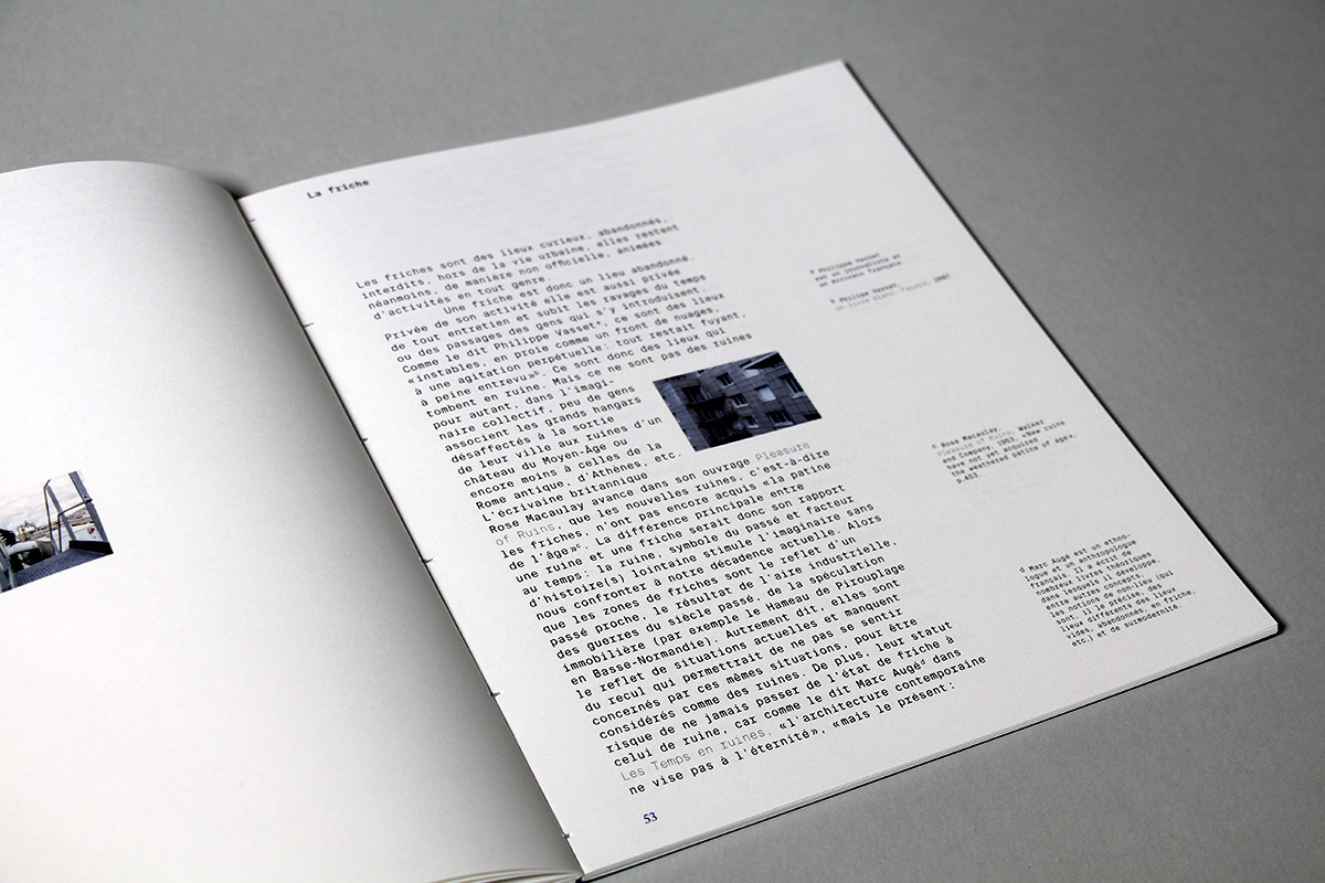 Le thème de mon mémoire de fin d’études porte sur le parkour. Dans cet objet, deux textes évoluent en parallèle au fil des pages. Le texte principal, toujours présenté sur la belle page, traite de l’histoire du parkour, de ce qu’est cette pratique, de ce qu’elle implique en termes de gestuelle et de rapport à l’espace. Le second texte, en vis-à-vis, développe des liens plus précis que j’ai faits entre le parkour et le design graphique. J’y aborde l’imagerie de ce sport au travers des marques de vêtements de parkour, la recherche d’une codification possible du mouvement et la notion d’espace dans le design graphique (mise en espace lors d’événements sportifs et d’une manière plus conceptuelle à partir de l’objet éditorial).