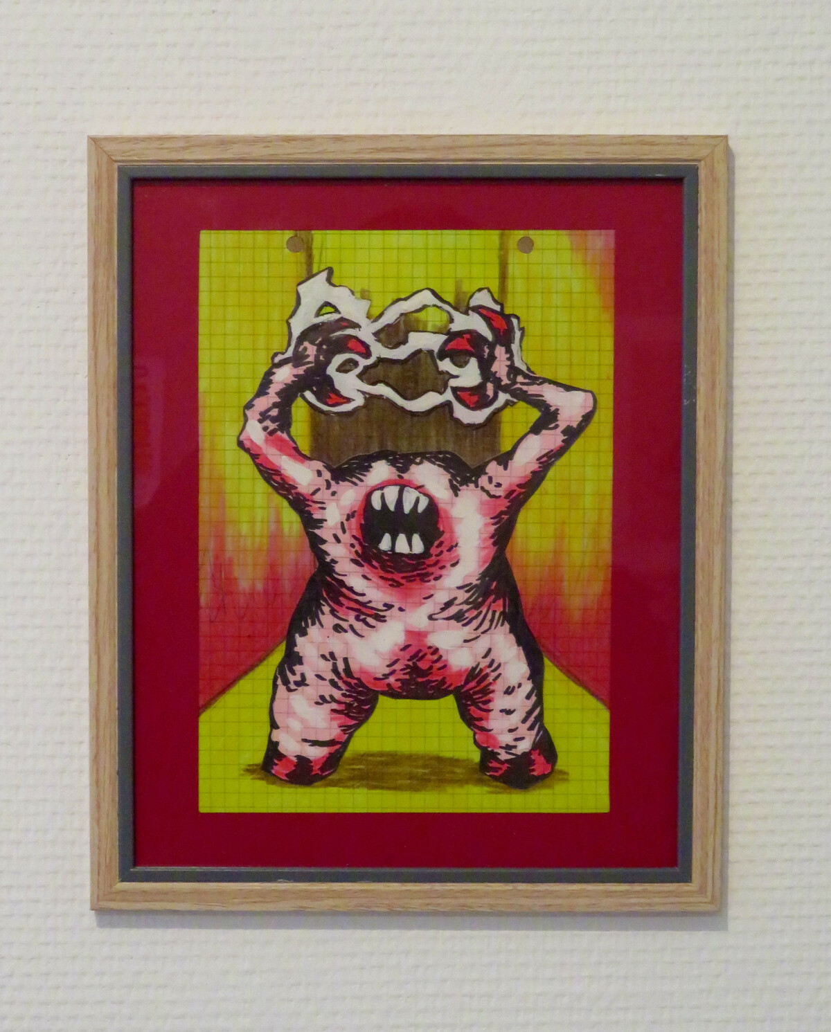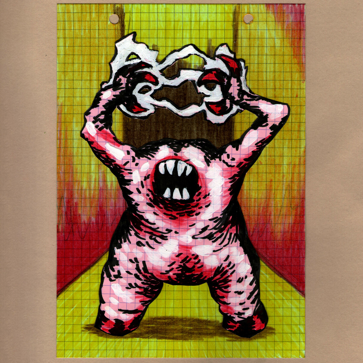 Dessin sur feuille Bristol, crayons de couleurs, feutres à alcool, acrylique, blanco, Inspiré du "Shambler", monstre issu du jeux "Quake" sorti en 1996. contact : blanchard.emilien@gmail.com