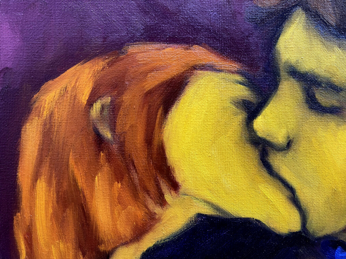 Sous le charme de la puissance picturale de Marlène Dumas, j'ai exécuté ce baiser passionné et torride d'adolescents. Les couleurs fortes et engagées m'ont été inspirées malgré moi par les scènes de couples dévoratrices d'Edvard Much que j'ai redécouvertes, subjuguée, au musée d'Orsay. Le titre provient d'une chanson du groupe Grandaddy, que j'écoutais adolescente, dont les paroles signifient peu ou prou : "Peu importe ce que l'on partage, tant que l'on est ensemble". Illustration idéale de cette peinture.